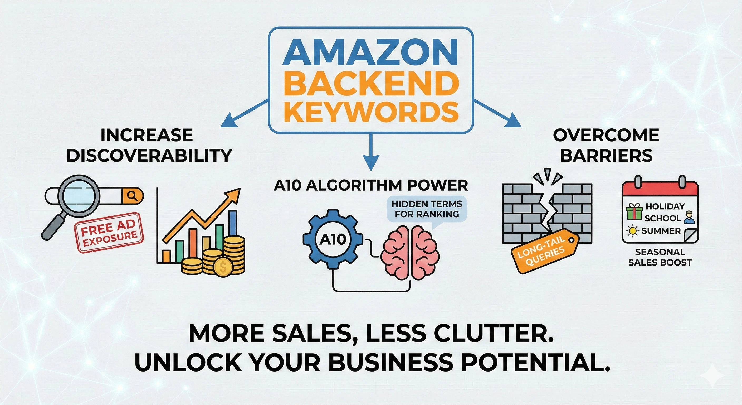 You can think of backend keywords as hidden signals to the Amazon search engine. They give your products more coverage without burdening the visible listing with extra words. This allows you to keep your title and bullets precise while still targeting as many additional search phrases as possible.